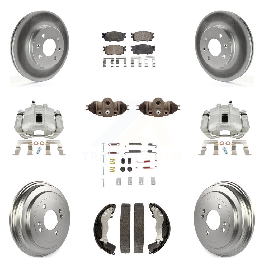 Front Rear Disc Brake Caliper Coated Rotors Drums Semi-Metallic Pads Shoes Wheel Cylinders And Hardware Kit (11Pc) For Hyundai Accent Kia Rio Rio5 KCG-100379P