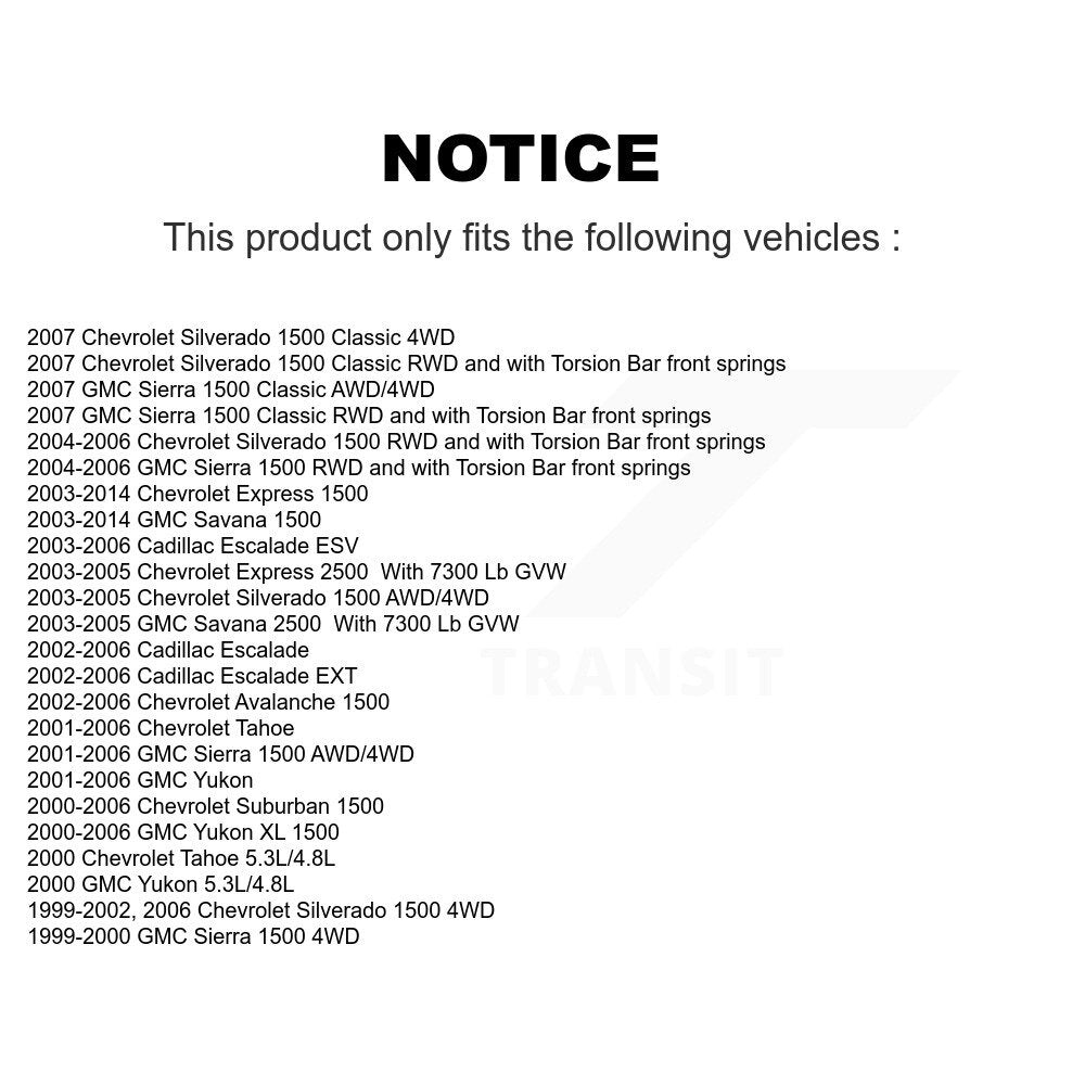 | 2007 | GMC | Sierra 1500 Classic | RWD and with Torsion Bar front springs | Front |